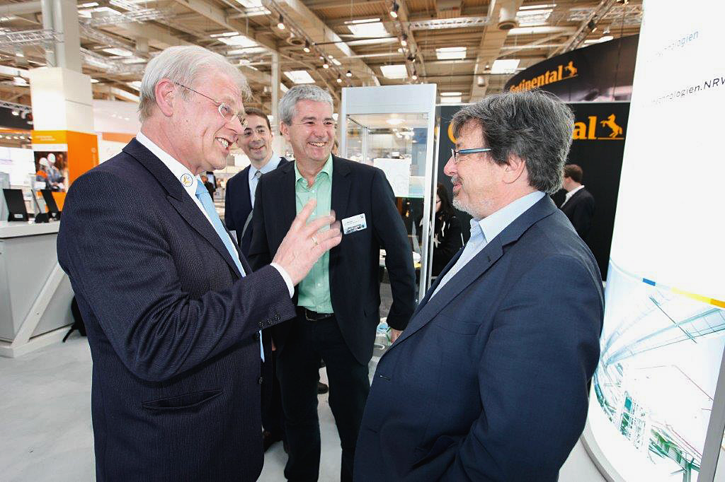 Im Gespräch (v.l.n.r.) Gerfried I. Bohlen, Dr. Christoph Leifer (Umweltministerium NRW), Marcus Bloser (Cluster Umwelttechnologien.NRW) und Staatssekreträr Peter Knitsch: