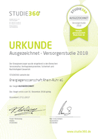 Die Energiegenossenschaft Rhein-Ruhr eG hat die Prämierung "Ausgezeichnet" von der Versorgerstudie 2018 verliehen bekommen. Das Siegel der STUDIE360 kennzeichnet transparente und faire Energieversorger. Mit einem Ergebnis von 85,7% setzt der Energieversorger aus Dinslaken vorbildliche Maßstäbe in der Energiewirtschaft und bietet faire und transparente Vertragskomponenten. Die Energiegenossenschaft Rhein-Ruhr eG wird den Nutzern des Verbraucherportals www.studie360.de nun empfohlen und darf sich als fairer und transparenter Energieversorger ausweisen.